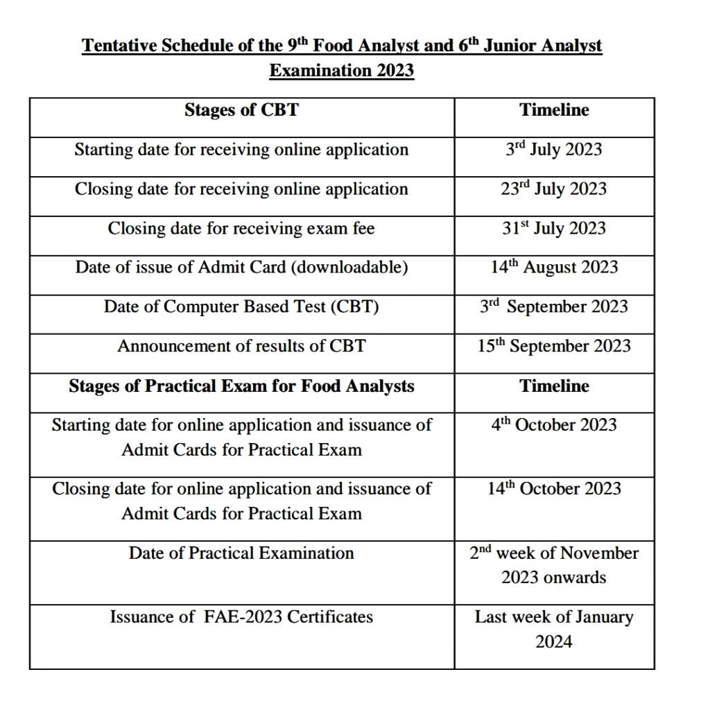 - Educational Qualification will be the same as that of the Food Analyst as on closingdate of the application, as prescribed in Advertisement published for 6th JAE, 2023 i.e 23rd July 2023