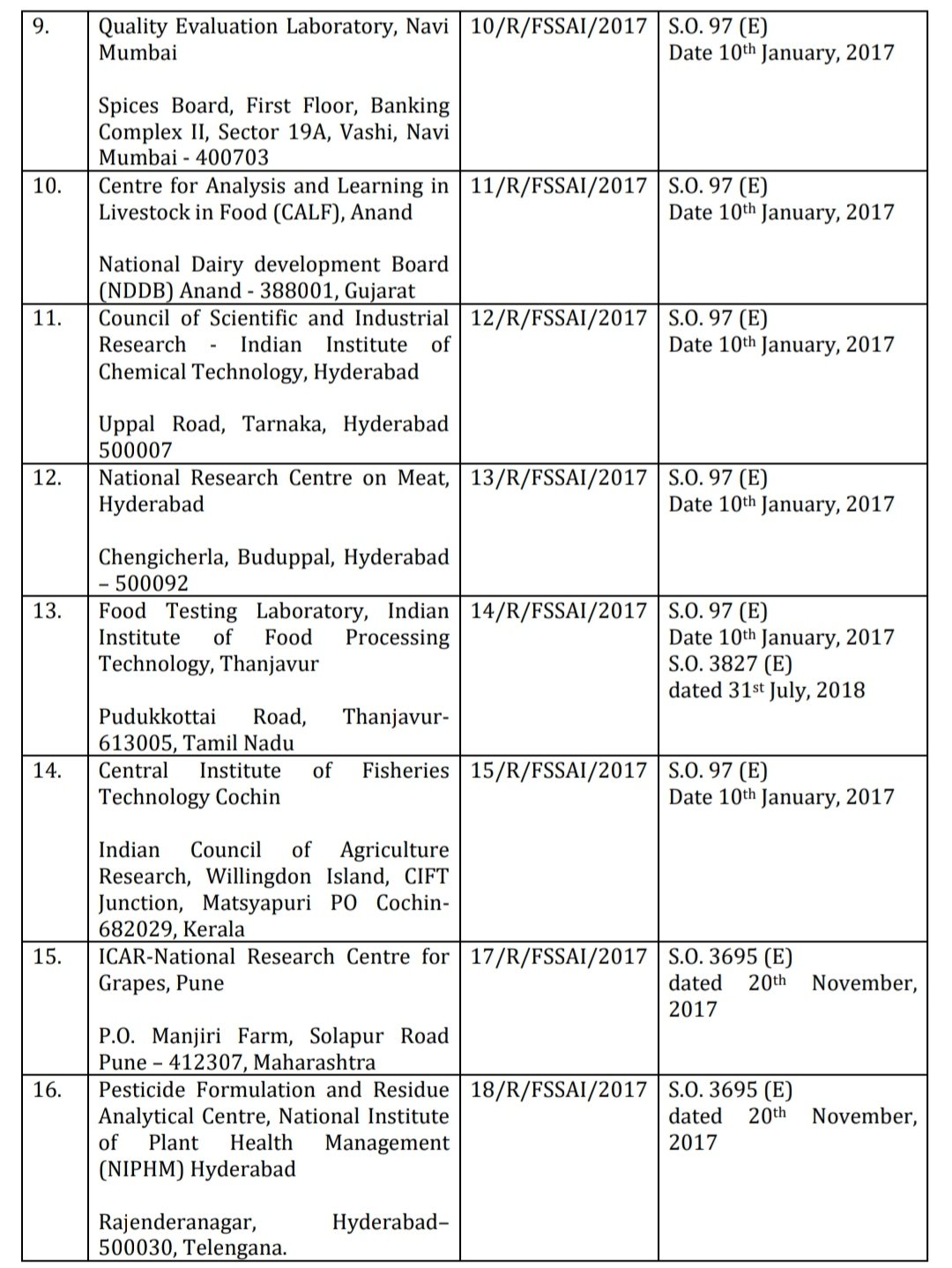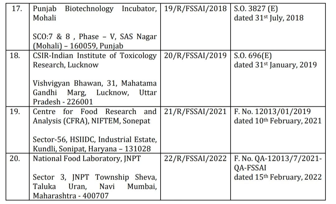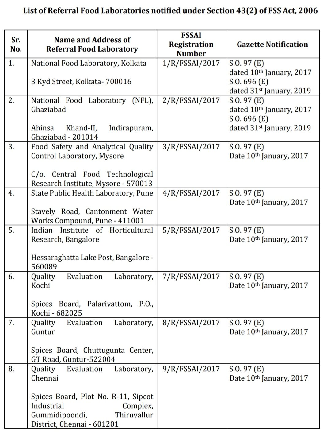 The list of 20 FSSAI notified Referral Food Laboratories along with their FSSAI Registration Number and corresponding Gazette Notification has been released by the FSSAI.