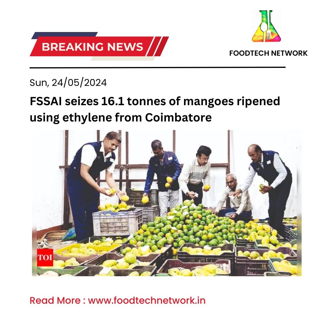 The Food Safety and Standards Authority of India (FSSAI) seized 16.1 tonnes of mangoes, which were found to have been ripened using ethylene sachets in an unapproved way, in simultaneous searches conducted in fruit shops in Coimbatore city on Thursday.