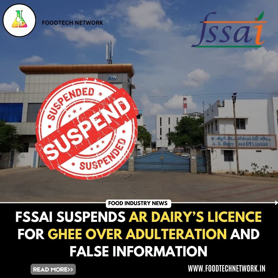 The Food Safety and Standards Authority of India (FSSAI) has suspended the licence of AR Dairy Food Pvt. Ltd., a Dindigul-based company in Tamil Nadu, for the manufacture, transport, and sale of ghee. The suspension, effective from 13 June 2025, comes after a detailed probe revealed serious violations under the Food Safety and Standards (FSS) Act, 2006.