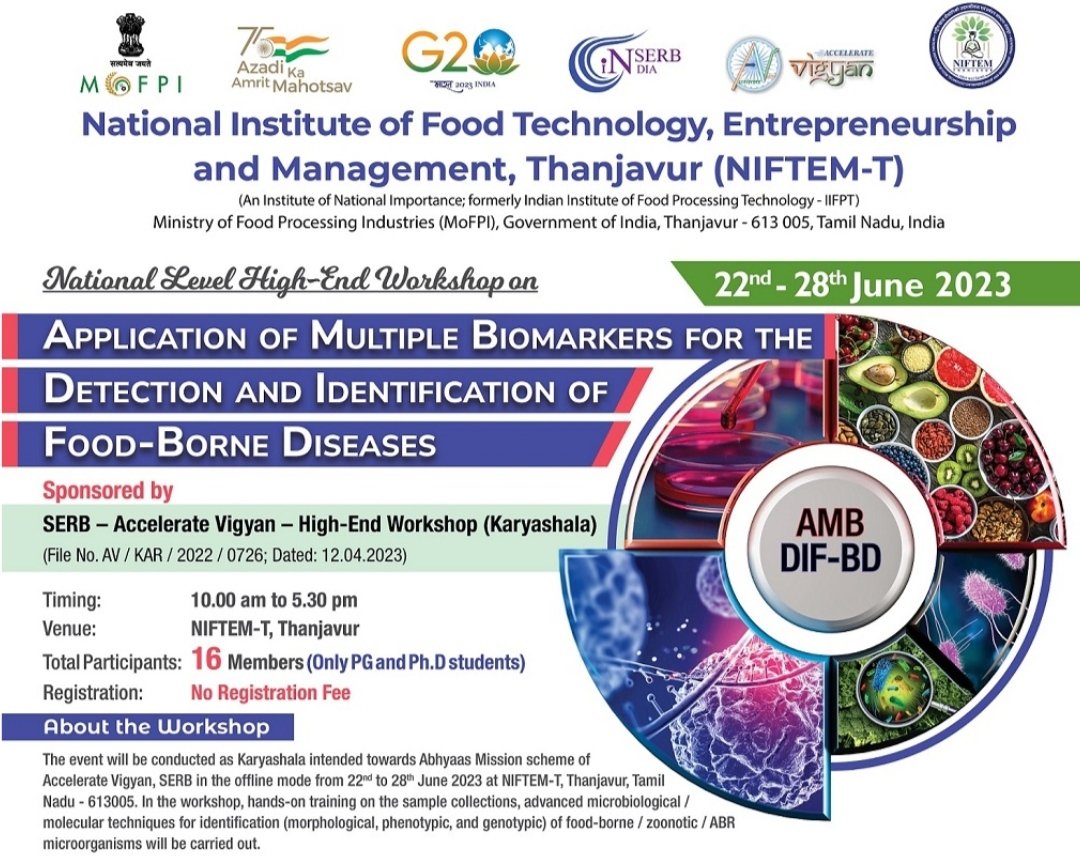 The event will be conducted as Karyashala intended towards Abhyaas Mission scheme of Accelerate Vigyan, SERB in the offline mode from 22ed to 28tb June 2023 at NIFTEM-T, Thanjavur, Tamil Nadu -613005. In the workshop, hands-on training on the sample collections, advanced microbiological / molecular techniques for identification (morphological, phenotypic, and genotypic) of food-borne / zoonotic / ABR microorganisms will be carried out.