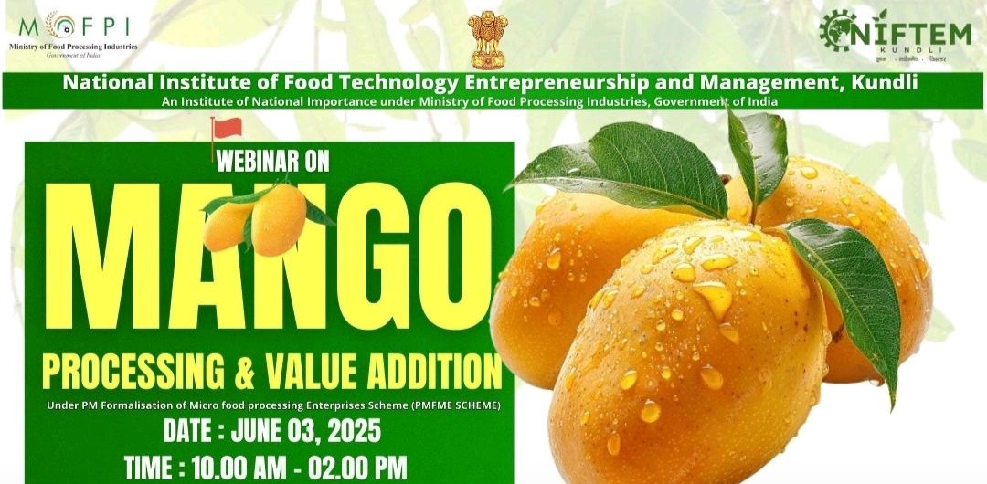We are excited to invite you to a National Webinar on “Mango Processing & Value Addition” scheduled for 3 June , 2025, starting 10:00 AM onwards, under the PM Formalisation of Micro Food Processing Enterprises (PMFME) Scheme.